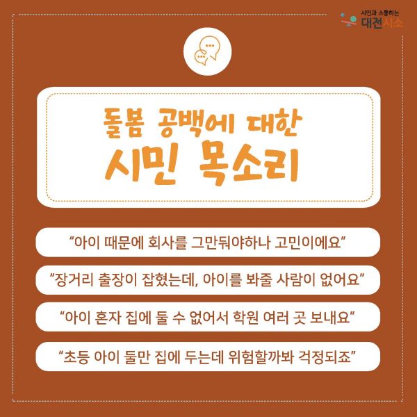 대전시는 현재 0세 전용 어린이집, 시간제 보육제공 어린이집, 공동육아나눔터 등 다양한 맞춤형 돌봄 서비스를 제공하고 있고 특히 부모의 출장·야근 또는 아동의 질병 등으로 발생하는 일시적인 양육공백을 해소하기 위해 여성가족부 국비사업인‘아이돌봄 지원사업’을 운영하고 있다고 답변한 바 있다.