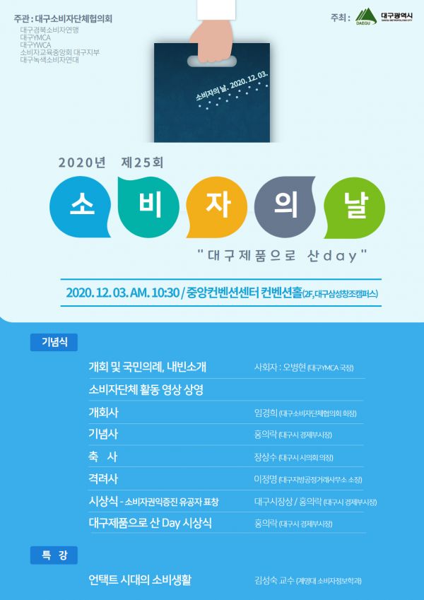 올해로 25회를 맞이하는 ‘소비자의 날’은 소비자의 권리 의식을 신장시키고 소비자 보호에 대한 인식을 높이기 위해 제정한 법정기념일로 매년 12월 3일 행사가 개최된다.