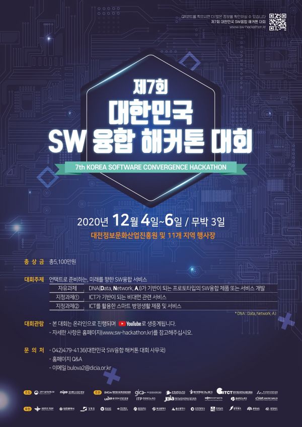 [충청뉴스큐] 대전시와 대전정보문화산업진흥원은 ‘언택트로 준비하는, 미래를 향한 SW융합서비스’라는 주제로 ‘제7회 대한민국 SW융합 해커톤 대회’를 12월 4일부터 6일까지 무박 3일 동안 대전정보문화산업진흥원을 비롯한 11개 지역 행사장에서 개최한다고 밝혔다.