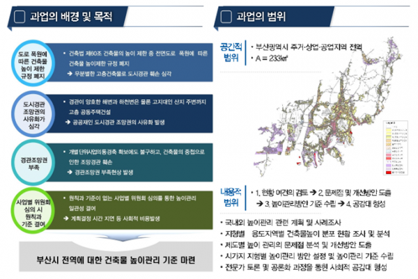 그동안 부산시와 학회는 부산시의 건축물 현황 조사와 국내외 도시의 높이 관리 사례조사 제도별 높이 관리 문제점 분석 및 개선방안을 도출 전문가 및 건축·건설 관계자 세미나 및 토론회 총괄건축가 자문 시의회 보고 관련 부서 협의 부산시 도시계획위원회 자문 등을 거쳤으며 용역 결과를 기준으로 ‘부산시 도시계획위원회 높이계획 관리 운영지침’을 마련해 향후 부산시 도시계획위원회 심의 시 활용할 예정이다.