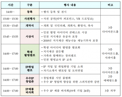 또한 온 가족이 함께할 수 있는 창의캠프와 인천지역 초·중·고 발명 영재들의 발명아이디어를 발표하는 경연의 장을 마련하여 학생들의 창의력을 증진하고 어렵게만 느껴질 수 있는 지식재산에 흥미를 가지고 쉽게 다가갈 수 있도록 OX퀴즈, 패자부활전 등 ‘도전 골든벨’ 퀴즈쇼 형식으로 지식재산에 대한 관심을 높일 예정이다.