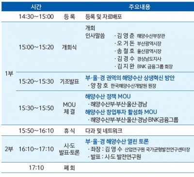 우선, 해양수산부, 부산시, 울산시, 경남도는 해양레저관광 활성화와 수산업 혁신 등 해양수산 신성장동력 창출 지원과 부산·울산·경남 항만의 경쟁력 강화 등을 내용으로 하는 업무협약을 체결한다.