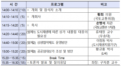 이 날 토론회에서는 ‘도시재생지역 내 상권 활성화 및 상가내몰림 현상 대응의 필요성’에 대한 우송대 류태창 교수의 발제를 시작으로, ‘상생협약제도 운영방안’, ‘공공임대상가 공급 및 법제화 방안’ 등을 발표하고, 구자훈 한양대학교 교수를 좌장으로 상가내몰림 현상과 대응방안에 대해 실제 현장의 생생한 목소리가 담긴 토론이 이어진다.