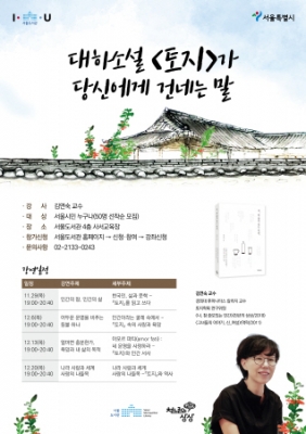 "대하소설 ‘토지’가 당신에게 건네는 말" 강연은 20일부터 ‘서울도서관 홈페이지→신청·참여→강좌 신청’에서 신청할 수 있다. 일반시민 누구나 참가비 무료로 참여 가능하며, 강좌별 50명씩 선착순으로 참가자를 모집한다.