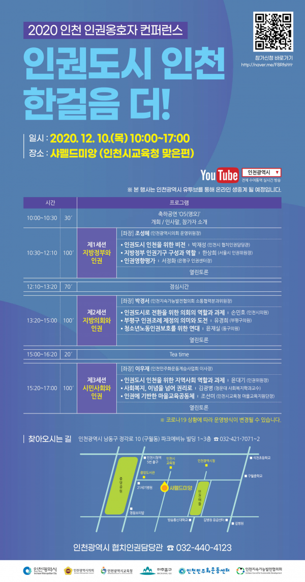 이번 컨퍼런스는 인천시, 인천광역시의회, 인천시교육청, 미추홀구, 인천민주화운동센터, 인천지속가능발전협의회가 공동 주관했으며 장애인 인권활동가 노래패‘05’의 축하공연으로 시작돼 인권과 행정 인권과 의회 인권과 시민사회 3가지 세션으로 운영됐다.