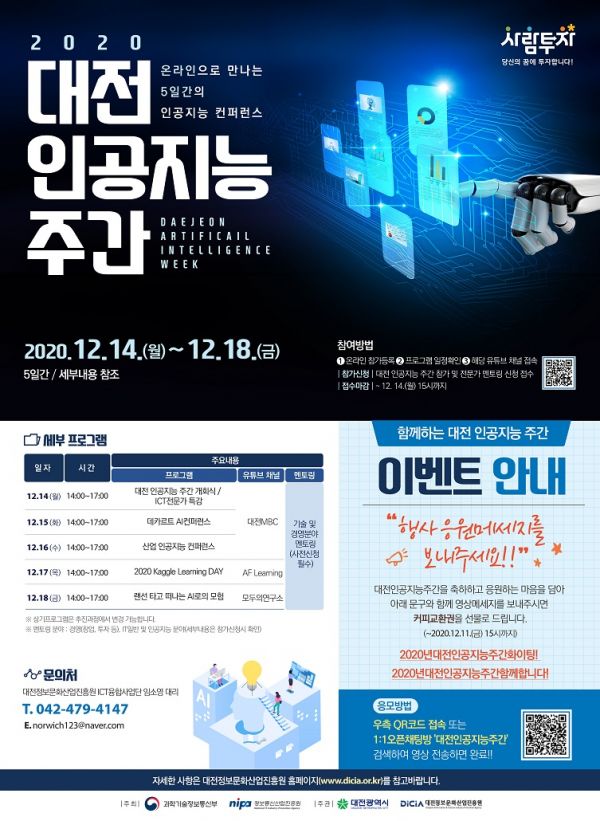 [충청뉴스큐] 대전시와 대전정보문화산업진흥원은, 12월 14일부터 18일까지 5일간‘2020년 대전 인공지능 주간’을 온라인으로 개최한다고 밝혔다.