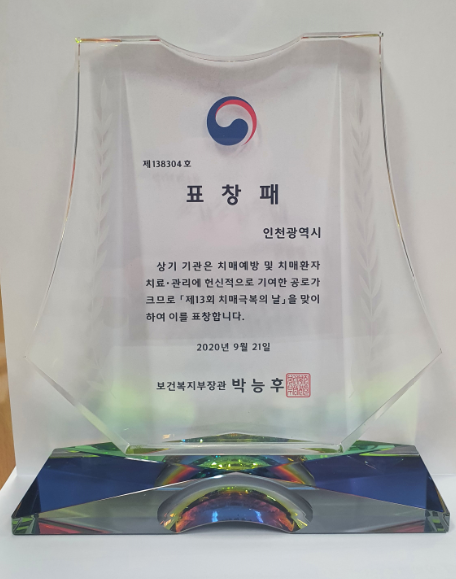 이번 표창은 보건복지부에서 전국 17개 시·도 광역치매센터 우수사례를 평가한 결과, 코로나19 상황에서 치매관리사업 수행을 위한 적합한 대안 마련에 대한 성과를 인정받은 결과로 지난 9월 인천시가 치매예방관리 우수기관으로 보건복지부장관 기관상을 수상한 데 이은 연이은 수상이라서 그 의미가 더욱 크다.