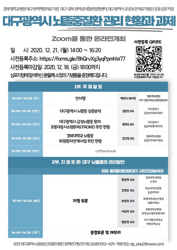 [충청뉴스큐] 대구 권역 책임의료기관인 경북대학교병원과 대구·경북권역 심뇌혈관질환센터, 대구광역시 공공보건의료지원단이 함께 오는 21일 오후 ‘대구광역시 뇌졸중질환 관리 현황과 과제’라는 주제로 온라인 심포지엄을 개최한다.