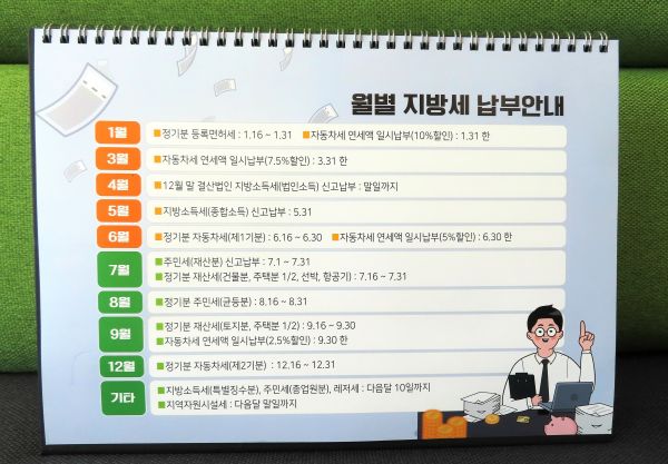 서병훈 세정과장은 “이번 달력은 납세자가 기한 내 지방세를 납부할 수 있도록 돕고 천안 관광 명소도 널리 알릴 수 있을 것”이라며 “앞으로도 익숙지 않은 지방세 관련 제도를 시민이 쉽게 알 수 있도록 다양한 방법으로 홍보해 납세자 권익보호와 건전한 납세풍토 조성에 최선을 다하겠다”고 말했다.