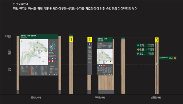 ‘인천형 숲길 안내사인’은 나이, 성별, 국적에 상관없이 누구나 쉽게 알아보고 이해할 수 있도록 유니버설디자인을 적용해 시민들의 안전하고 편리한 걷기를 도울 것으로 기대된다.