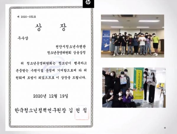 [충청뉴스큐] 천안시청소년수련관 청소년운영위원회 ‘상송상청’이 2020년 전국 청소년수련시설 청소년운영위원회 평가에서 우수 청소년운영위원회로 선정돼 한국청소년정책연구원장상을 수상했다.