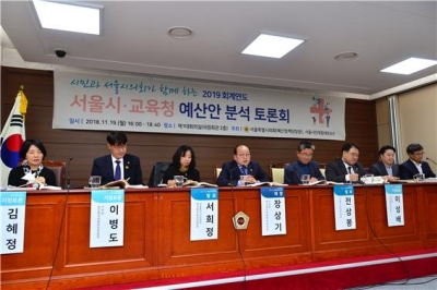 2019년도 서울시와 교육청 재정 규모는 총 48조 2,500억원에 이르고 있고 이중 서울시는 2018년도보다 3조 9,702억원이 증가한 예산 35조 7,843억원, 기금 3조 700억원, 교육청 재정은 9조 3,900억원이다. 이는 역대 최대 규모로 장상기 부위원장을 비롯하여 각 분야 전문가들과 함께 2019년도 서울시와 교육청 살림에 대해 심층적인 분석과 대안을 논의하는 시간을 가졌다.