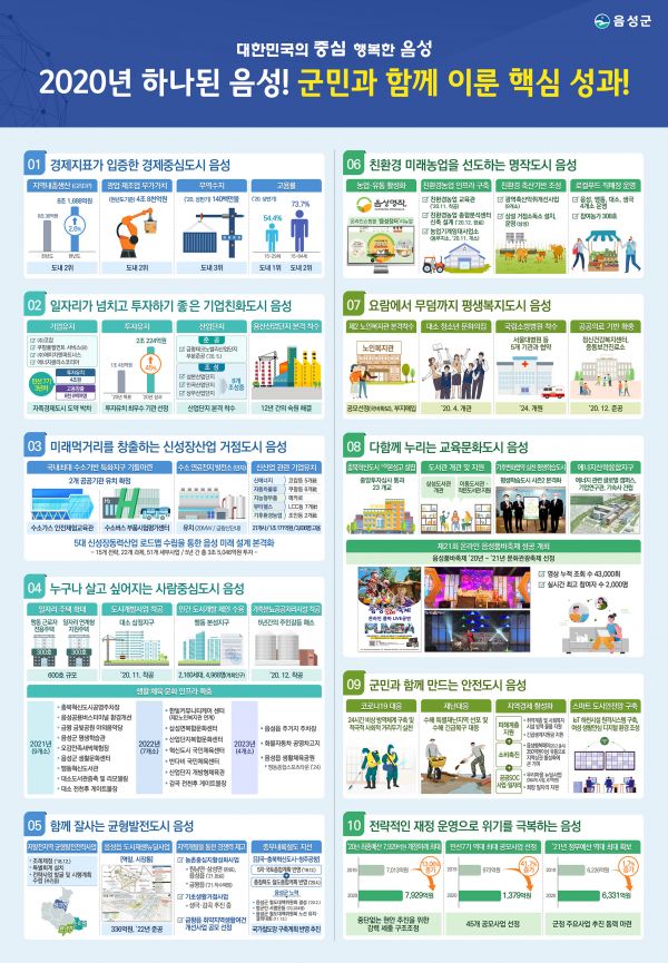 [충청뉴스큐] 충북 음성군이 올 한 해 코로나19 등 전례 없는 재난 위기와 이로 인한 경기침체 등 어려운 여건 속에서도 신속한 위기 대응 체계 구축과 주요 현안에 대한 군정역량을 집중해 결실을 맺은 성과 중에서 군정발전에 대한 기여도와 효과성 등을 종합적으로 고려해 선정한 10대 핵심성과를 발표했다.