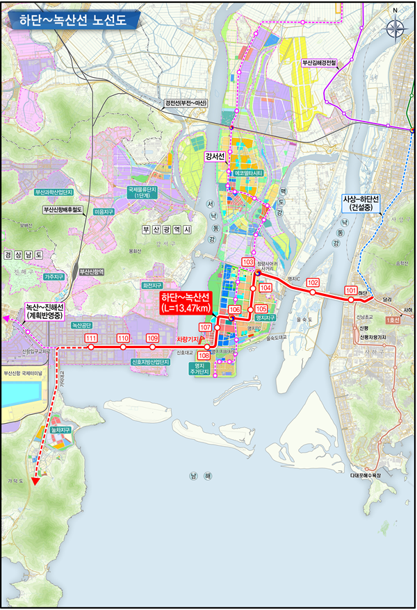 ‘도시철도 하단~녹산선 건설사업’은 현재 건설 중인 도시철도 사상∼하단선을 직결로 연장해 도시철도 1호선 하단역에서 명지를 지나 녹산공단을 연결하는 노선이다.