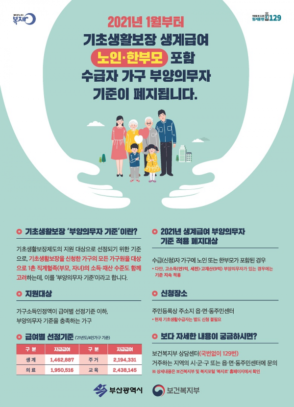 [충청뉴스큐] 부산시가 2021년 1월부터 ‘생계급여 수급자 부양의무자 기준’을 폐지한다고 밝혔다.