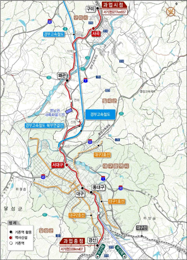 정거장 계획 : 구미~사곡~왜관~서대구~대구~동대구~경산 하루 편도 61회 운행할 계획이라고 전했다.