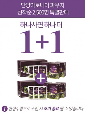지금까지 단양아로니아 파우치는 70㎖ 크기 30포 가격이 55000원으로 판매됐지만 할인 기간에 파우치를 구입하면 같은 가격에 30포를 더 받을 수 있다.