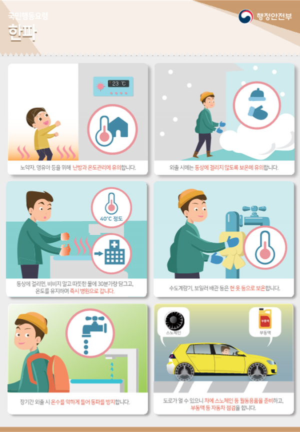 또한, 가정에서는 계량기·수도관 동파나 보일러 파손, 정전 등과 같은 시설물 피해와 겨울철 농작물·양식장 등 냉해도 주의할 필요가 있다.