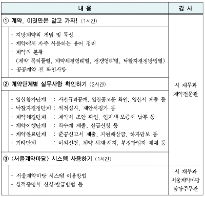 이에 시는 기업들의 의견을 적극 수용하여 내년부터 계약실무교육 과정을 연 2회 반기별로 정규 편성·운영할 예정이며, 구체적인 교육 일정과 참가신청방법 등은 서울계약마당 홈페이지를 통해 별도 공지할 예정이다.