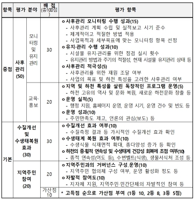 올해 생태하천복원사업 우수사례 경연은 시·도 추천과 유역환경청 1차 평가를 거쳐, 7일 학계·전문기관 등의 전문가로 구성된 평가위원회의 최종 평가 순으로 진행되었으며, 복원 사후관리에 중점을 두고 우수사례를 평가했다.