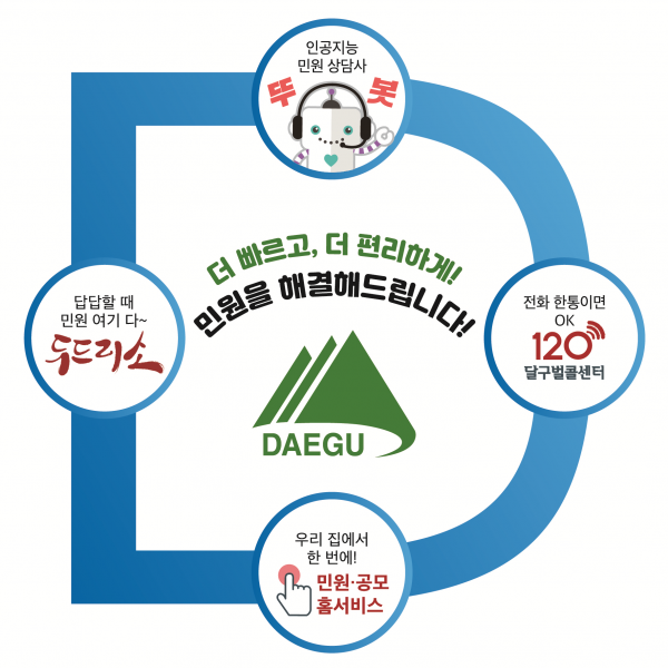 대표적인 대구시 비대면 민원 서비스로는 ‘두드리소’, ‘뚜봇’, ‘120달구벌콜센터’ 및 ‘민원·공모홈서비스’가 있다.