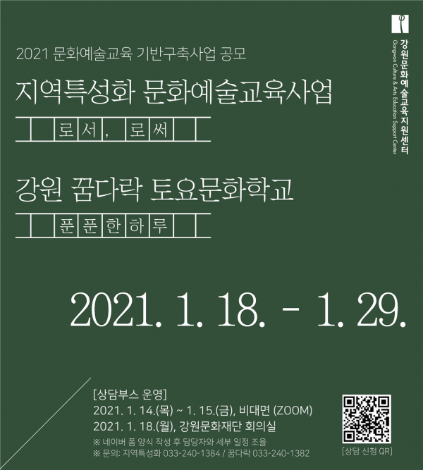 [충청뉴스큐] 강원문화재단이 오는 1월 18일부터 29일까지 도민들을 위해 문화예술교육 프로그램을 진행할 단체 및 기관을 모집한다.