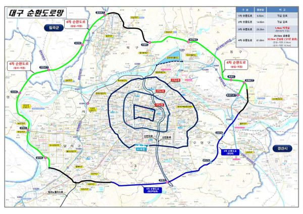 대구4차 순환도로의 전체 연장은 61.6㎞이며 현재 절반가량인 29.1㎞가 대구시에서 건설해 운영 중에 있다.