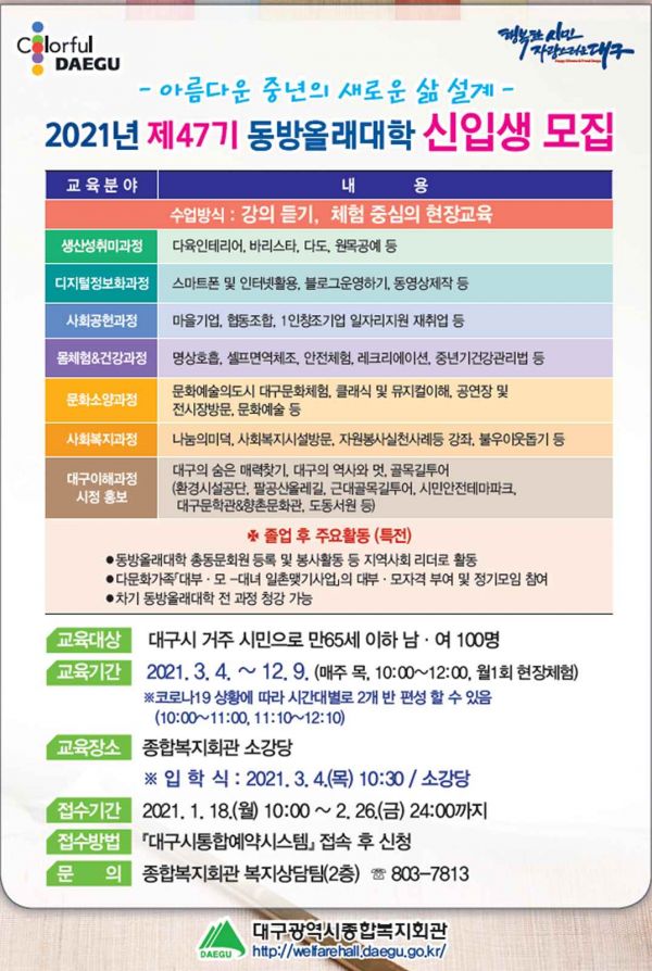 [충청뉴스큐] 대구시 종합복지회관에서는 50, 60대 신중년의 새로운 삶 설계와 적극적인 사회 참여 활동을 지원하기 위해 ‘동방올래대학’을 개설하고 남·여 신입생 100명을 선착순 모집한다.