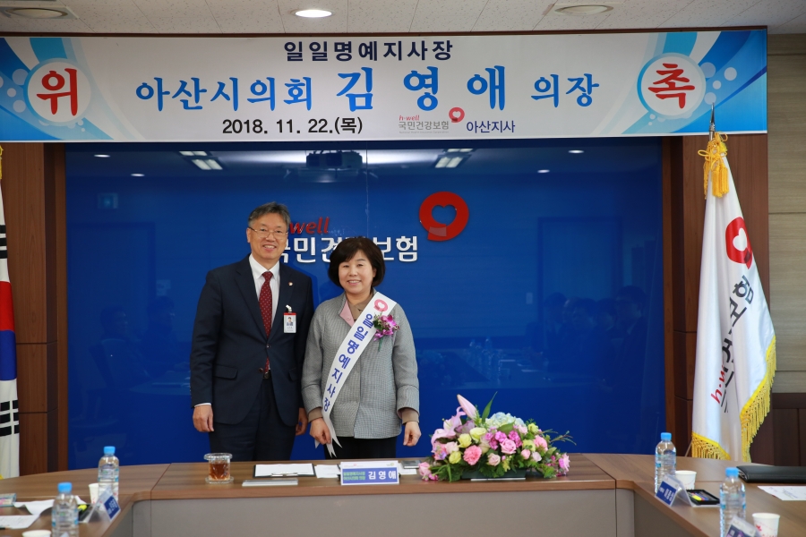 아산시의회 김영애 의장이 22일, 국민건강보험공단 아산지사(지사장 오두용)에서 일일 명예지사장으로 활동했다. 김영애 의장은 오두용 지사장으로부터 명예지사장 위촉장을 받은 후 명예지사장 활동에 앞서 지사 관계자로부터 인력현황과 건강보험 적용현황, 노인장기요양보험 인정현황 등 지사현황에 대한 설명을 듣고 건강보험 보장성 강화 정책 등 공단 주요 현안에 대해 공감하며 업무를 이해하는 시간을 가졌다. 이어, 김 의장은 1층 민원창구에서 방문고객을 대상으로 민원을 접수하고 건강보험증 발급, 자격득실확인서 발급 등의 신청민원을 직접 처리하는 체험활동으로 일일 명예지사장의 소임을 다했다. 김 의장은 “이번 일일 명예지사장 현장 체험을 통해 건강보험 및 노인장기요양보험 제도에 대한 이해의 폭을 넓힐 수 있는 좋은 계기가 되었다”며 “앞으로도 국민건강 향상과 사회적 가치 실현에 앞장서는 공단의 역할을 기대하고 시민들이 건강하고 행복한 삶을 누릴 수 있도록 시의회 차원에서도 최선을 다 하겠다”고 말했다.