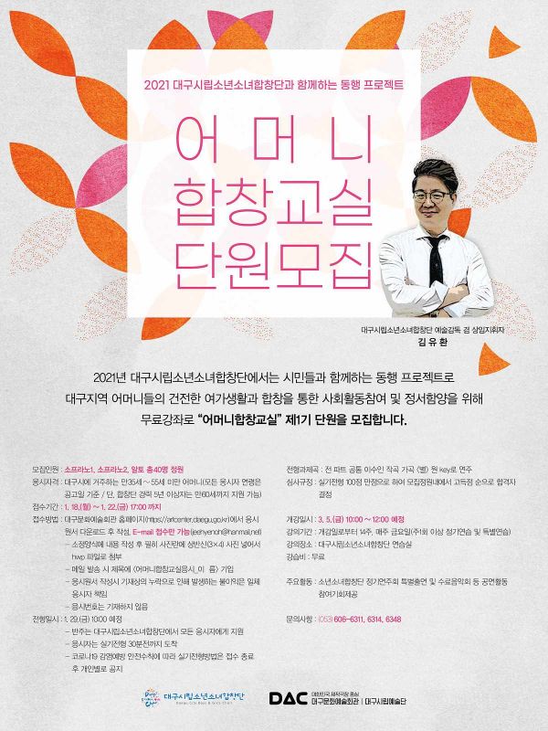 [충청뉴스큐] 대구시립소년소녀합창단에서는 창단 40주년을 맞아 대구 지역 어머니들의 건전한 여가생활과 합창을 통한 사회활동참여 확대를 위한 동행 프로젝트로 어머니합창교실 제1기 단원을 모집한다.