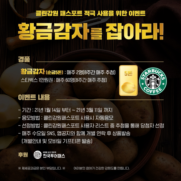 [충청뉴스큐] “클린강원패스포트”운영사인 한국투어패스는 1.14 ~ 3.11.까지 클린강원패스포트 가맹점 인증자를 대상으로“황금감자를 잡아라”이벤트를 추진한다고 밝혔다.