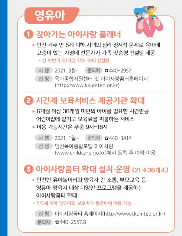조진숙 시 여성가족국장은 “공보육 인프라를 지속 확대해 지역사회가 함께하는 공동육아를 강화하고 촘촘한 돌봄 지원 사업을 펼쳐 부모와 자녀 모두 행복한 인천을 만들어 나가겠다”고 말했다.