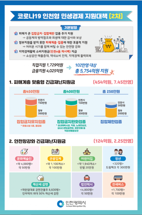 이른바 ‘인천형 핀셋 지원’으로 정부의 3차 재난지원금과 함께 인천시 자체적으로 5,700억원 규모의 추가 민생경제 지원을 통해 지역경제 어려움을 해소한다는 방침이다.