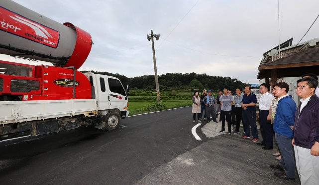 이날 한 시장은 수의동 지역 35ha에 조성된 친환경 벼 공동방제 추진 과정을 참관하고, 친환경농업인들의 애로사항을 청취했다.