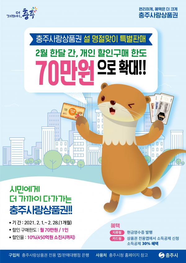 한편 시는 2019년 7월 출시된 충주사랑상품권의 누적 발행액은 900억원으로 전년도까지 820억원이 판매됐으며 1월 현재 기준 주유소, 학원, 병원, 식당 등 1만5천여 곳의 가맹점이 등록돼 코로나19로 침체한 지역경제 활성화에 기여하고 있다.