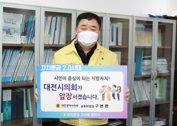 [충청뉴스큐] 대전시의회 구본환 의원은 22일 “시민이 중심이 되는 지방자치 대전시의회가 앞장서겠습니다”라는 메시지로 ‘자치분권 기대해 챌린지’ 캠페인에 동참했다.