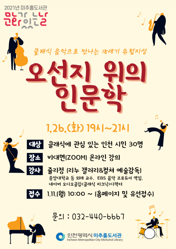[충청뉴스큐] 인천광역시는 미추홀도서관에서 1월 26일 오후 7시에 클래식에 관심 있는 인천시민 30명 대상으로 1월 문화가 있는 날‘오선지 위의 인문학’강연을 운영한다고 밝혔다.