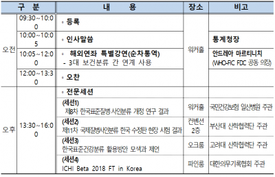제2세션에서는 세계보건기구에서 개발 중인 제11차 국제질병사인분류 중 완성도가 높은 대분류장에 대한 한글 작성, 분류체계와 내용분석, 현장적용시험 등 ICD-11의 체계적 국내 도입 준비를 위해 추진한 한국 수정판 현장적용 테스트 연구결과가 논의된다.