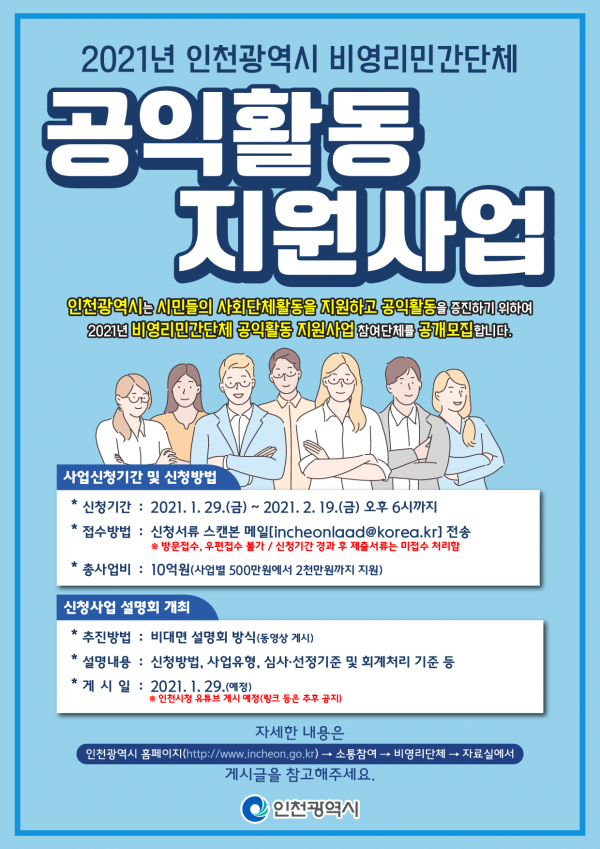 [충청뉴스큐] 인천광역시가 시민들의 사회단체활동을 지원하고 공익활동을 증진하기 위한 ‘2021년 비영리민간단체 공익활동 지원사업 공개모집’을 실시한다고 밝혔다.