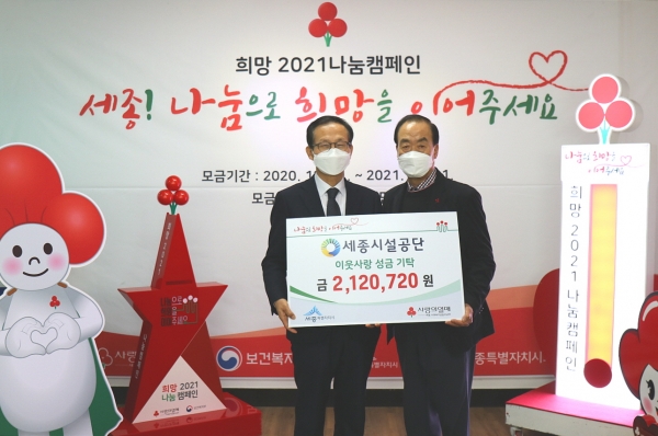 [충청뉴스큐] 세종특별자치시시설관리공단은 27일 연말연시 소외된 이웃에게 온정을 나누기 위해 사회복지공동모금회에서 추진하는 ‘희망2021 나눔 캠페인’에 동참해 성금 200여만원을 기탁했다고 밝혔다.