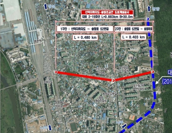 올해 토지보상을 실시한 후 내년부터 공사에 착수할 계획이며 송정초교부터 도산동 카이스트빌 2차 아파트까지 0.4㎞와 카이스트빌 2차에서 신덕지하차도까지 0.48㎞ 구간 등 2개 구간으로 나눠 진행된다.