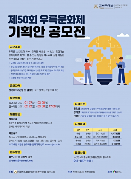 [충청뉴스큐] 한국예술문화단체총연합회 충주지회는 우륵문화제의 50주년을 기념하고 새로운 도약을 준비하기 위해 ‘제50회 우륵문화제 기획안 공모전’을 진행한다고 29일 밝혔다.