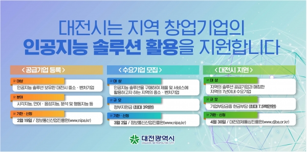 대전시 박문용 기업창업지원과장은 “인공지능 솔루션 활용지원을 통해 지역의 많은 창업기업들이 필요한 기술을 도입해 기업의 경쟁력을 높이고 가치를 격상시키는 기회가 되도록 하겠다”고 말했다.