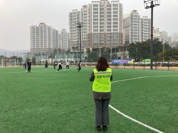 [충청뉴스큐] 천안시는 도시공원 내 체육시설 이용자 마스크 미착용 신고가 지속해서 접수됨에 따라 휴일마다 마스크 착용 및 사회적 거리두기 실천 계도 위주의 단속을 실시한다고 밝혔다.