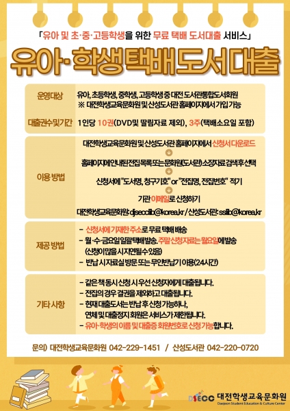 [충청뉴스큐] 대전학생교육문화원에서는 코로나19 상황으로 도서 이용이 어려운 유아, 어린이 대상으로 운영했던‘무료 택배 도서대출 서비스’를 초·중·고등학생까지 확대한다고 밝혔다.