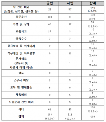 비위 유형별로 보면 성희롱, 성추행, 성폭행 등 성 관련 비위가 119건으로 가장 많은 비율을 차지했다. 이어 음주운전 110건 , 폭행 59건, 교통사고 30건, 금품수수 14건, 회계비리 12건 등 순이었다