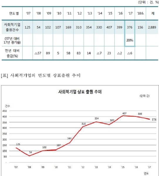특허청에 따르면, 사회적기업 인증제도 시행 후 사회적기업의 상표출원 건수는 인증 초기인 지난 2007년에 125건에서 2017년에는 376건으로 3배가량 증가한 것으로 조사됐다.