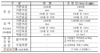 서울시에서 제출한 택시요금 인상 조정안은 주간요금 25%, 심야요금 50%인상을 주요골자로 거리요금 및 시간요금을 조정하여 주간 10km, 25분 운행기준 현행 12,900원에서 14,700원으로 약 14%요금이 인상되는 것으로 나타났다.
