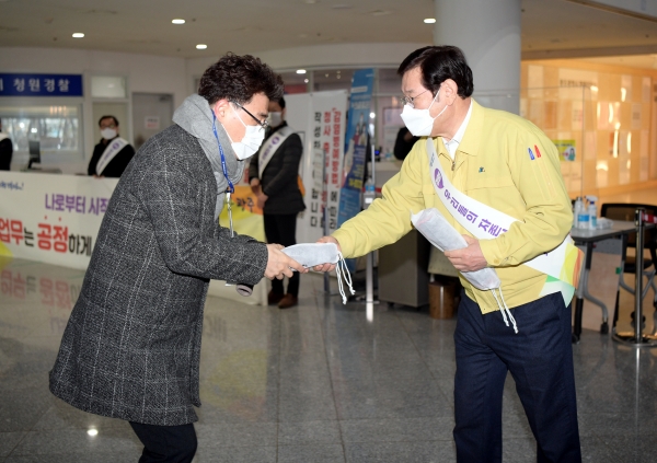 오전 7시40분부터 시작한 캠페인에는 이용섭 시장을 비롯한 시 간부 공무원과 감사위원회 직원 등이 참여해 출근하는 공무원들에게 청렴 홍보물을 배부하며 청렴 의지를 다졌다.