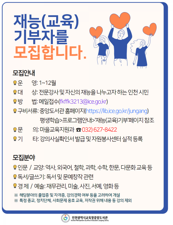 [충청뉴스큐] 인천시교육청중앙도서관은 시민의 자발적 재능기부를 통해 배움의 소중함과 나눔의 기쁨을 실천하는 재능기부자를 모집한다고 밝혔다.